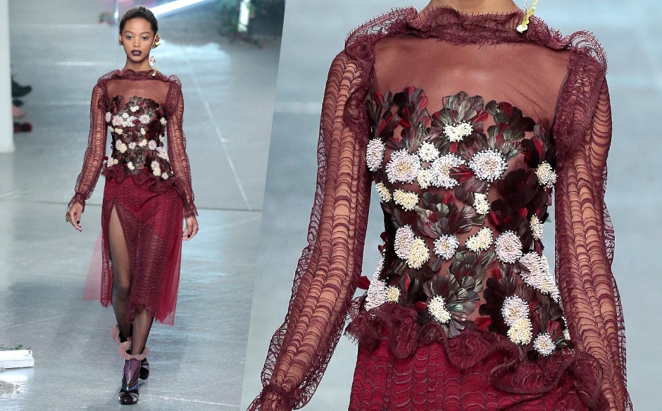 A Rodarte na Semana de Moda de NY 2016 exemplifica bem as tendências que eu comentei. As flores aparecem em aplicações, fugindo de uma estampa mais convencional. A própria cor escolhida para a peça, faz referência a flores, pode-se dizer que a modelo se transforma em flor, com todas suas pétalas (detalhe das mangas), delicadeza (transparência) e sensualidade (fenda).