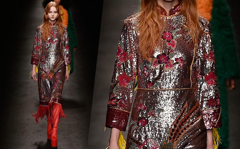 A GUCCI na Semana de Moda de Milão 2016, também apostou na tendência das flores, porém adicionou o metalizado que também retornou com força na semana de moda italiana. O comprimento midi também continua em alta e outro queridinho que vai e vem sempre marca presença nas passarelas de todos os continentes é o Militar.